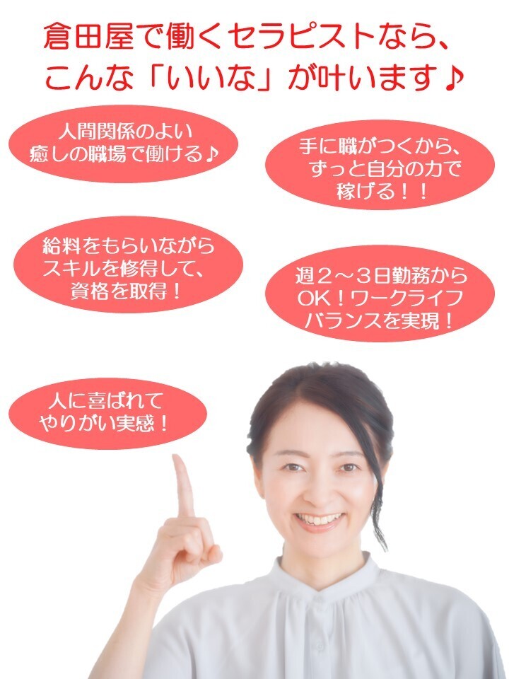 延べ20万人を施術してきた実績のある癒し処倉田屋だから、独自のノウハウに基づく研修を受ければ、誰でもプロとして活躍できるようになります!